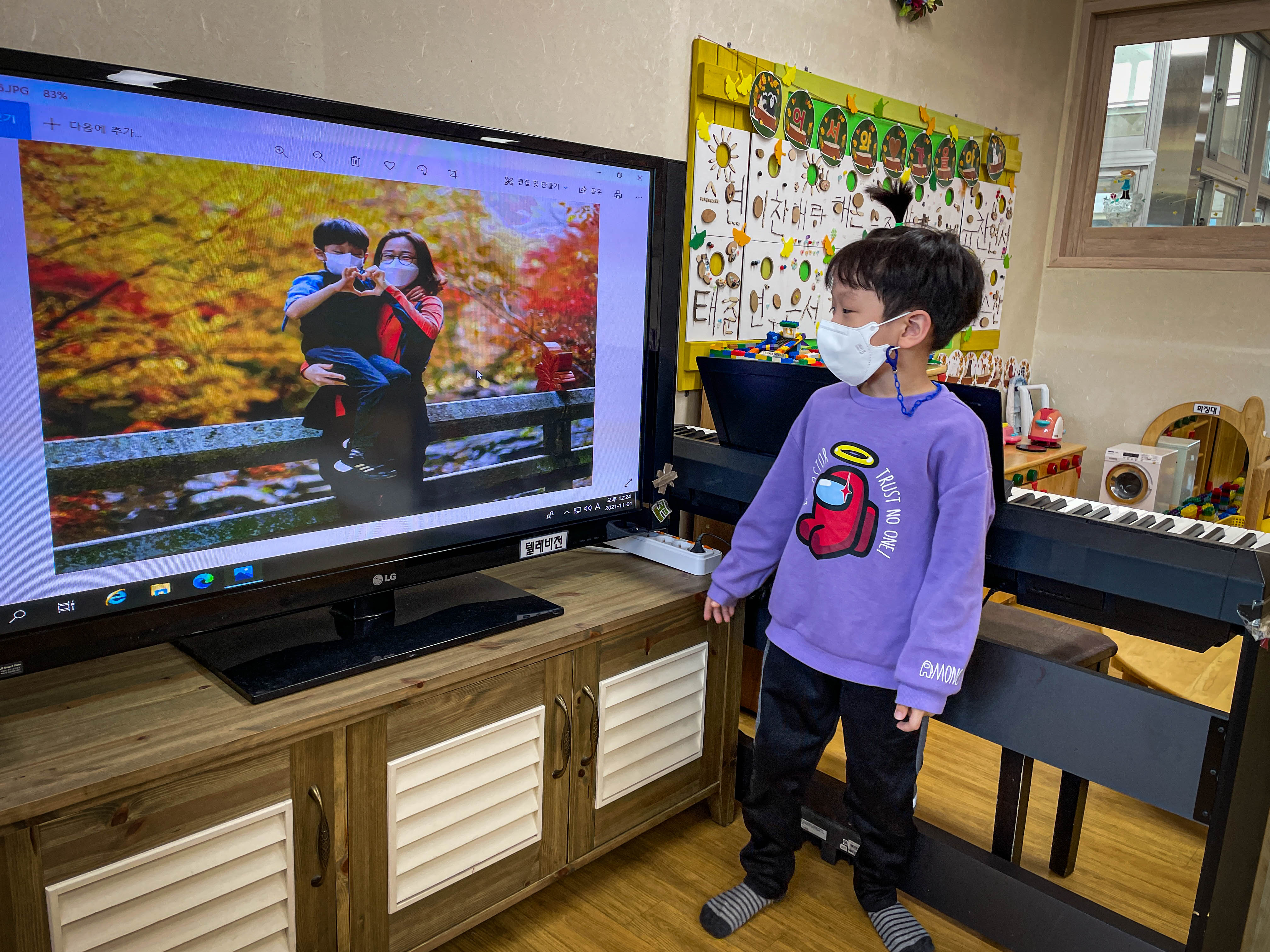 유치원에서 강천산에 갔던 이야기를 친구들과 나누는 준범